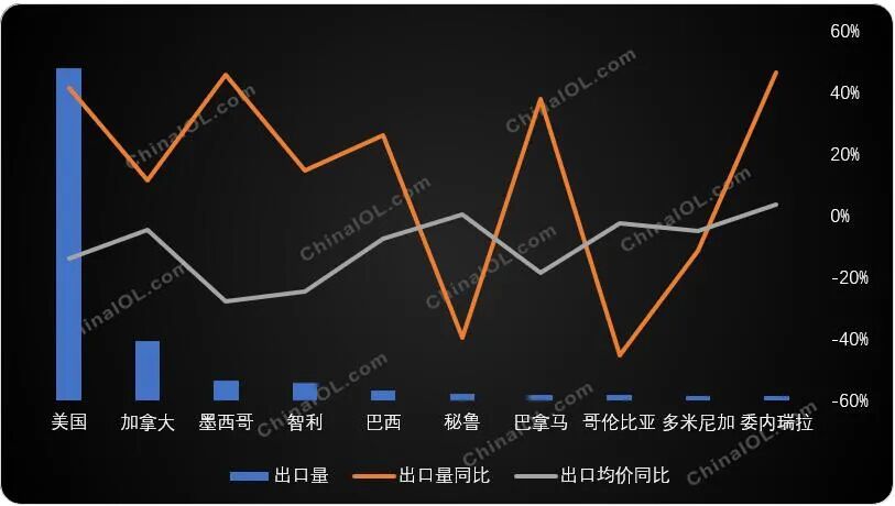 从出口至美洲的TOP10国家来看,美国和墨西哥同比都呈大幅增长,其中美国的量超过400万台,占出口至全美洲总量的67%左右;出口至哥伦比亚的量同比下滑最多。出口量与出口均价有一定的负相关性。